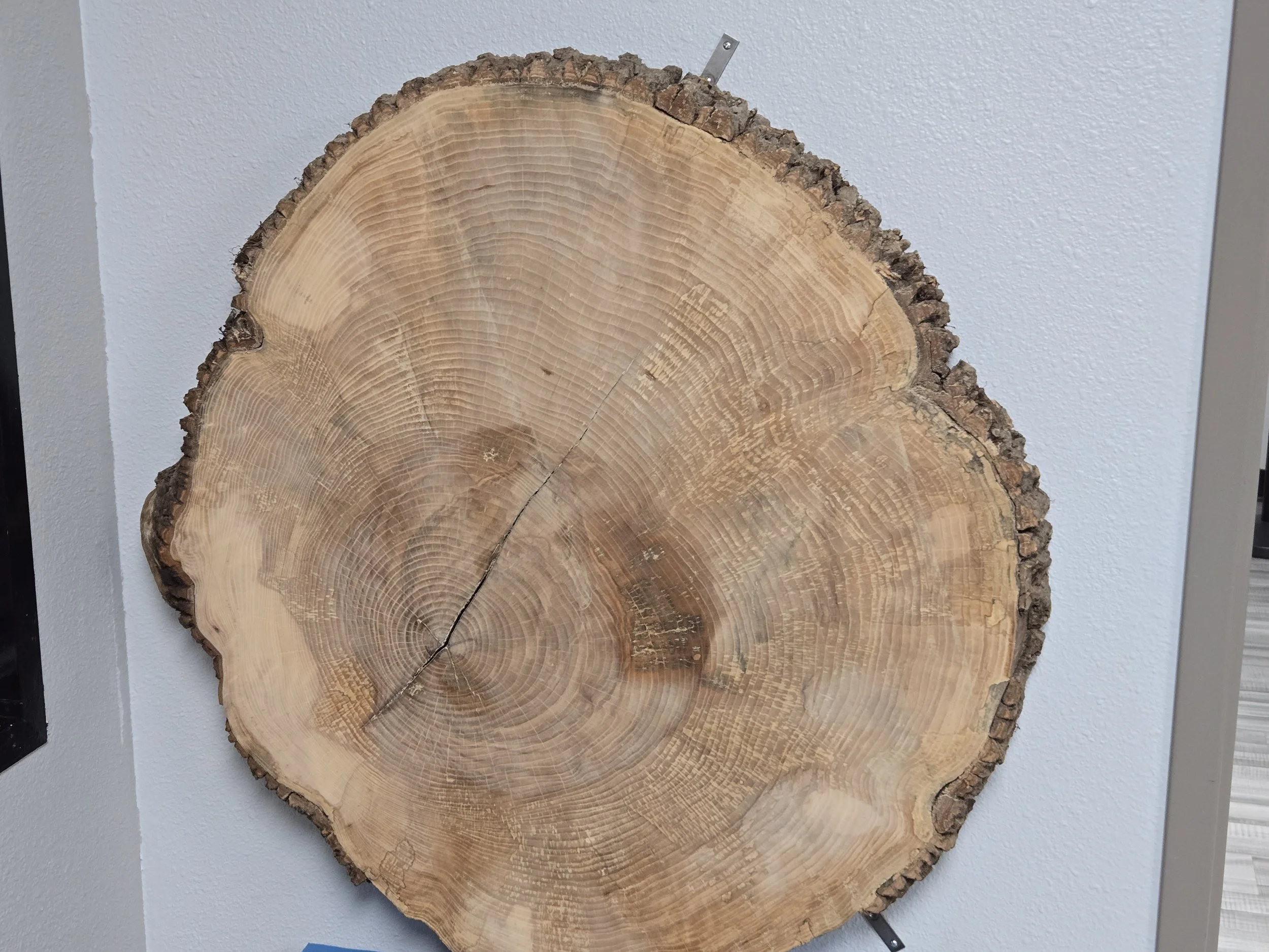 A cross-section of Bentonville’s 2024 tornado-felled Champion Tree. Its growth rings will be marked over time with local and world history — a living record of resilience.